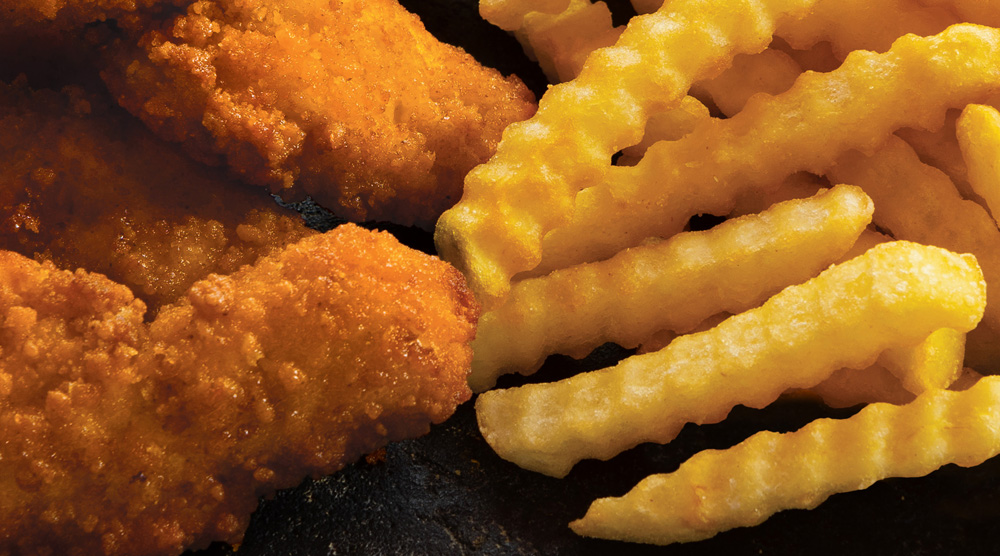 Portion with fried chicken fingers (frzn), crispy crinkle-cut fries (frzn) & Johnie chicken sauce