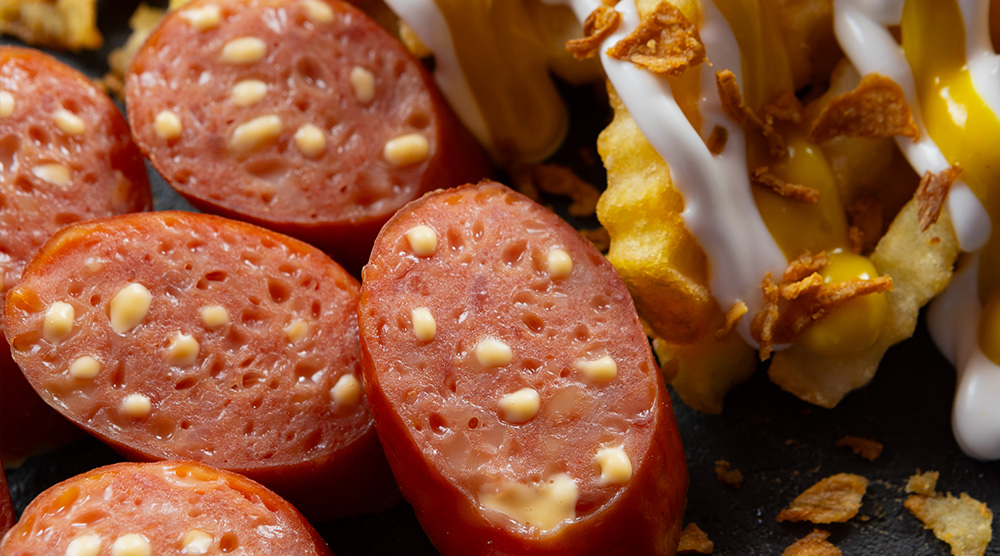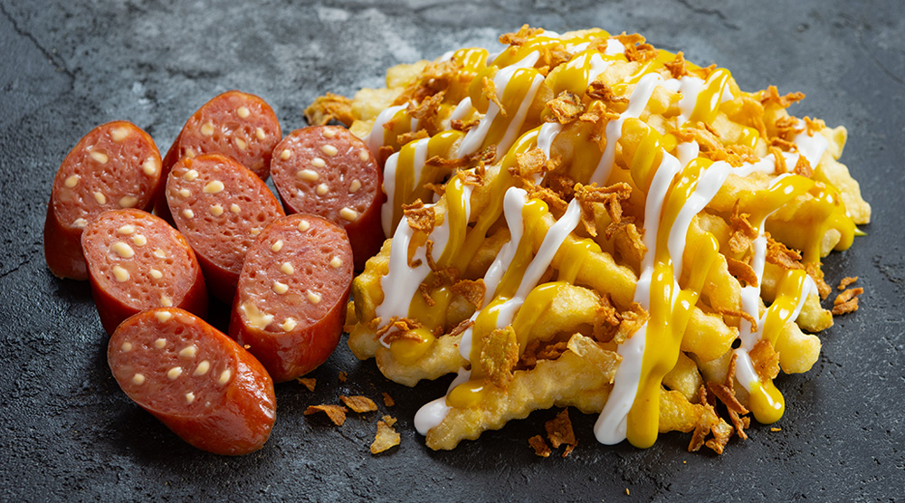 Portion with one sausage stuffed with Gouda cheese