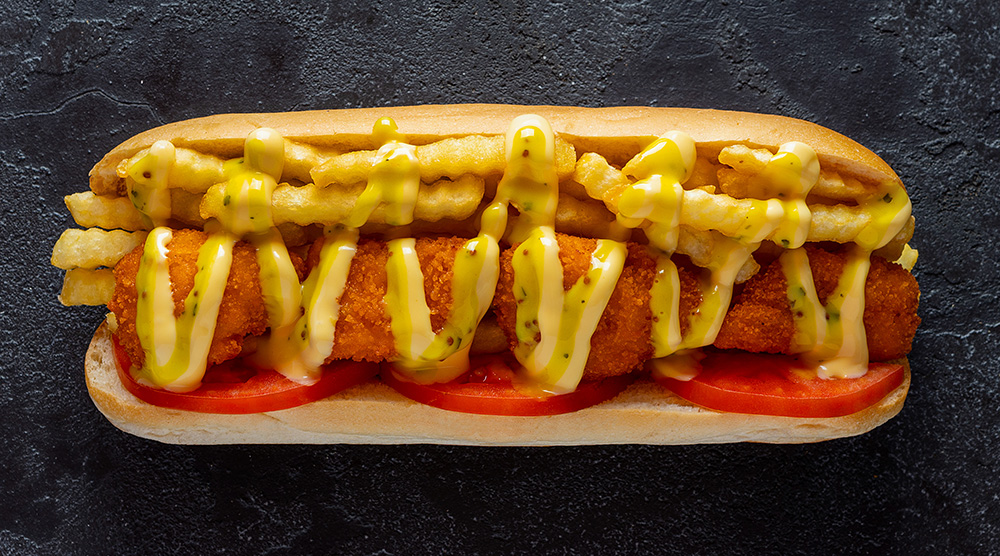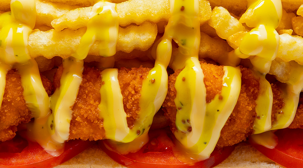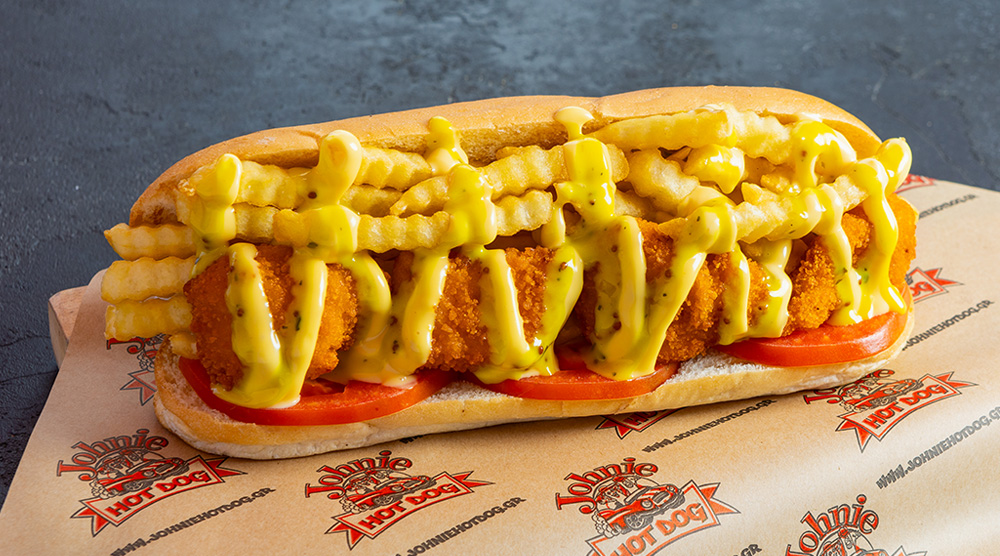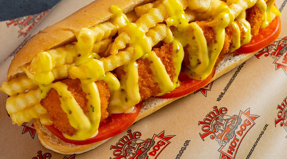 Ψωμάκι ζεστό με κοτομπουκιές (κτψ.), πατάτες τηγανητές crispy crinkle-cut (κτψ.), ντομάτα, μουστάρδα με μέλι & frittas sauce