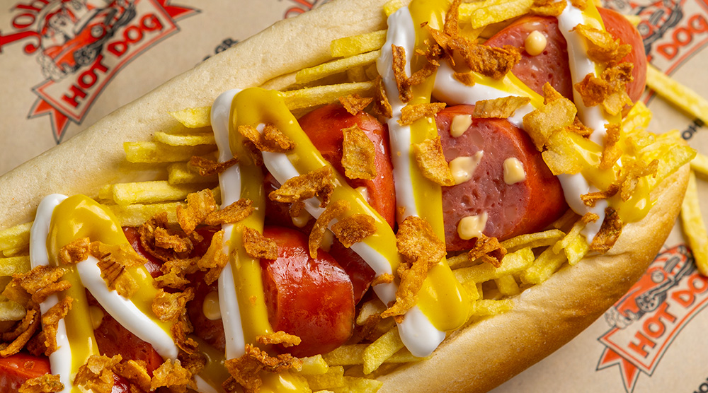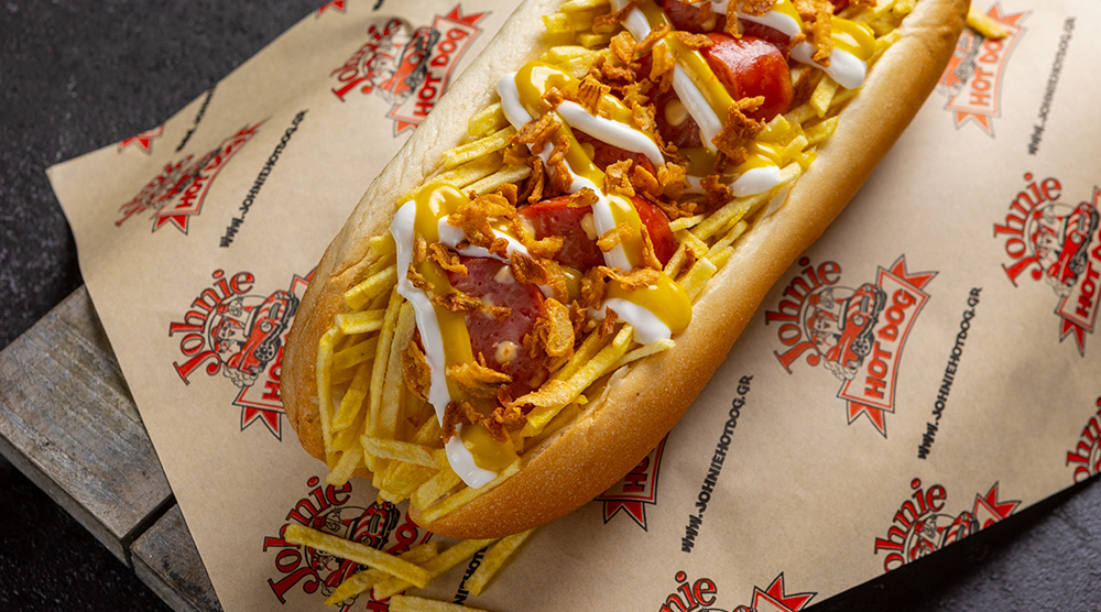Λουκάνικο γεμιστό με τυρί gouda, τραγανό παναρισμένο κρεμμυδάκι, πατατάκια sticks, μουστάρδα & μαγιονέζα
