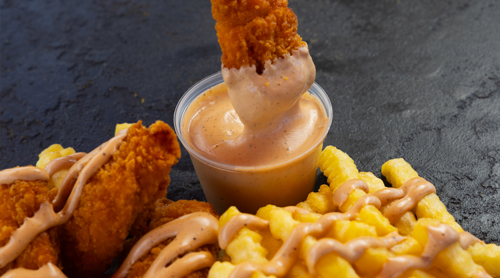 Mερίδα με fried chicken fingers (κτψ.), πατάτες τηγανητές crispy crinkle-cut (κτψ.) & Johnie chicken sauce
